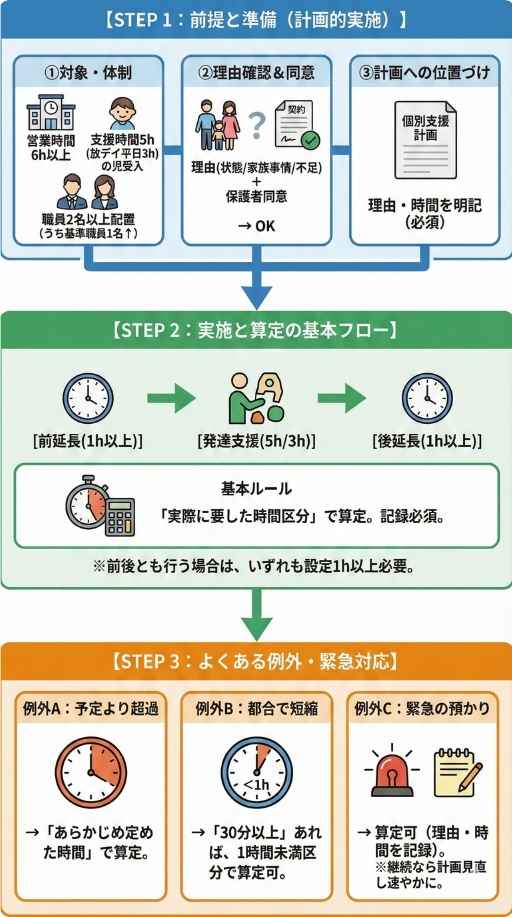 • その基本の3時間(または5時間)の前後に、計画的に延長を行った場合のみ加算が取れるというルールです。